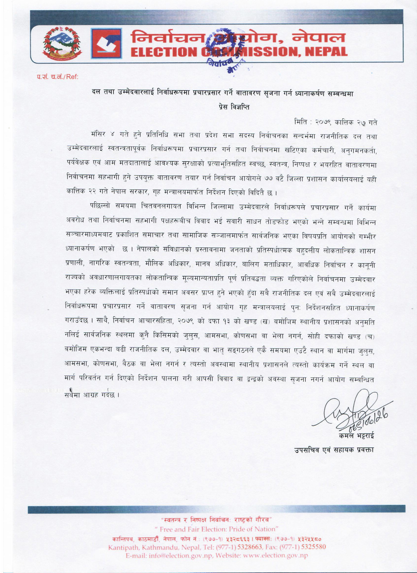 आयोगका सहायक प्रवक्ता कमल भट्टराईले जारी गरेको विज्ञप्तिमा भनिएको छ, ‘नेपालको संविधानको प्रस्तावनामा जनताको प्रतिस्पर्धात्मक बहुदलीय लोकतान्त्रिक शासन प्रणाली, नागरिक स्वतन्त्रता, मौलिक अधिकार, मानव अधिकार, बालिग मताधिकार, आवधिक निर्वाचन र कानुनी राज्यको अवधारणालगायतका लोकतान्त्रिक मूल्यमान्यताप्रति पूर्ण प्रतिबद्धता व्यक्त गरिएकोले निर्वाचनमा उम्मेदवार भएका हरेक व्यक्तिलाई प्रतिस्पर्धाको समान अवसर प्राप्त हुने भएको हुँदा सबै राजनीतिक दल एवं सबै उम्मेदवारलाई निर्वाधरूपमा प्रचारप्रसार गर्ने वातावरण सृजना गर्न आयोग गृह मन्त्रालयलाई पुनः निर्देशनसहित ध्यानाकर्षण गराइएको छ ।’
