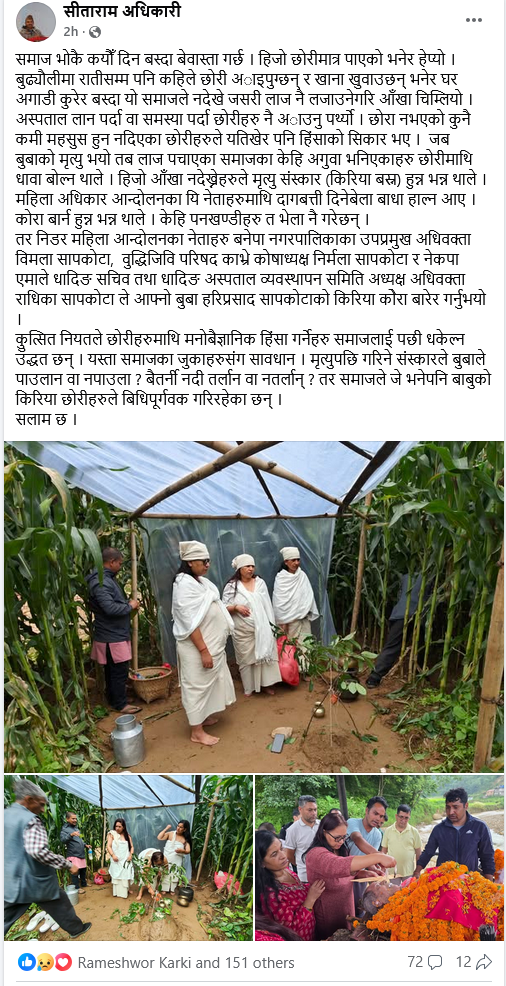 रयाले – बाबु आमाको निधनपछि छोरा, नाति, दाजुभाइले मात्रै दागवत्ती र किरिया गर्नुपर्ने ‘पीतृसतात्मक’ सोच तोड्न ‘हिम्मतिला’ ३ छोरीले बाबुको ‘किरिया’ गरेका छन् ।