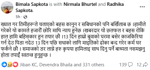 बिमलाले सामाजिक सञ्जालबाटै आक्रोशसमेत व्यक्त गरेकी छन् । आफूहरु बहिस्कार हुन तयार रहेको भन्दै कानुन र संविधानविपरितको काम नगर्न चेतावनीसमेत दिएकी छन् ।