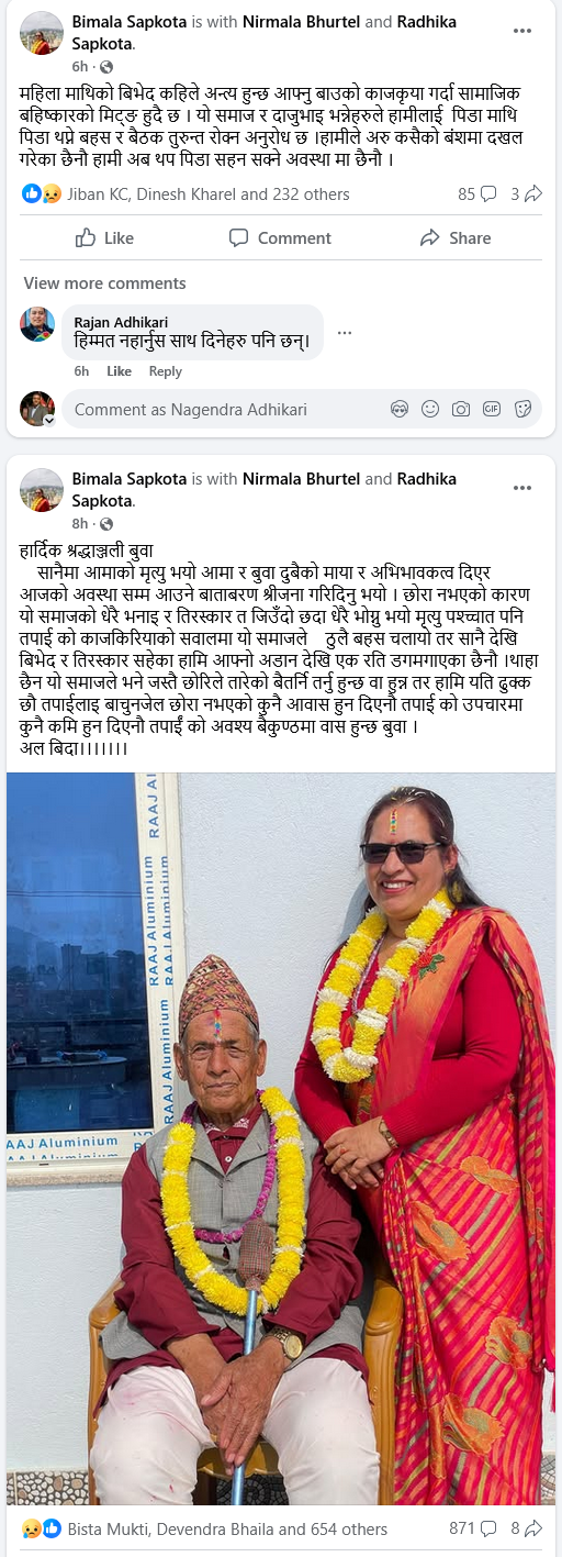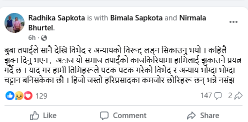 राधिकाले पनि बुबाले विभेद र अन्यायविरुद्ध सधै लड्न सिकाएको सामाजिक सञ्जाल फेसबुकमा लेखेकी छन् ।