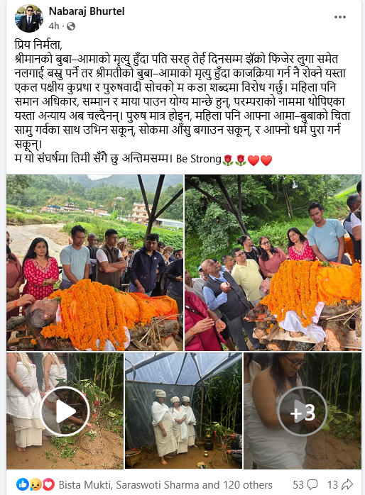 छोरीहरुले दागबत्ती दिनुहुदैन र किरिया बस्नुहुदैन भन्ने बहस र बैठकलाई उनीहरुले चुनौती दिएका छन् । ‘अधिकार र न्यानको पक्षमा लड्दै’ हरिप्रसादका तीनै छोरी समाजमा सन्देश दिन लागि परेका छन् ।